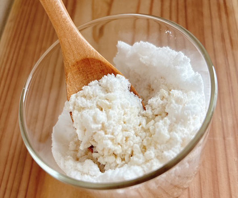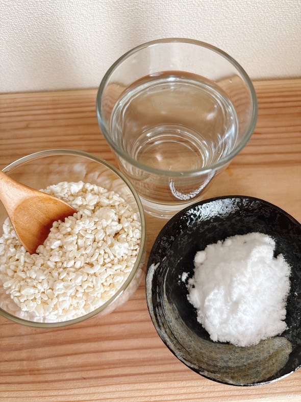 ①煮沸またはアルコール消毒をした清潔なガラス瓶に、米麹と塩を入れる。