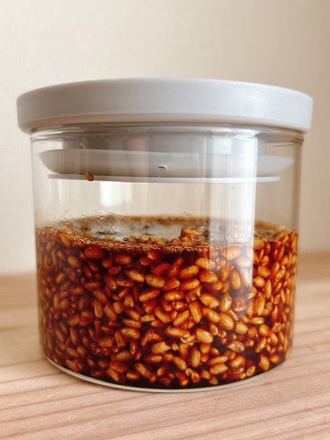 ⑤毎日1回、清潔なスプーンや箸で混ぜ、5~7日後麹がやわらかくなり、とろりとして甘い香りがしたら完成。冷蔵庫で保存し、なるべく1ヶ月以内に使い切る。