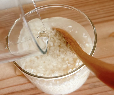 ③水を少しずつ加え、全体がしっとりするまでなじませる。乾燥麹の場合はひたひたになるくらいを目安に。