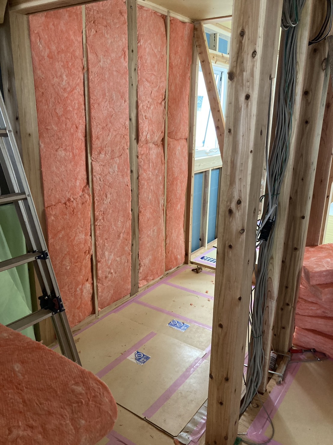 現場はとても 暑い中ですが床貼りから壁断熱を丁寧に施工してくださっています。