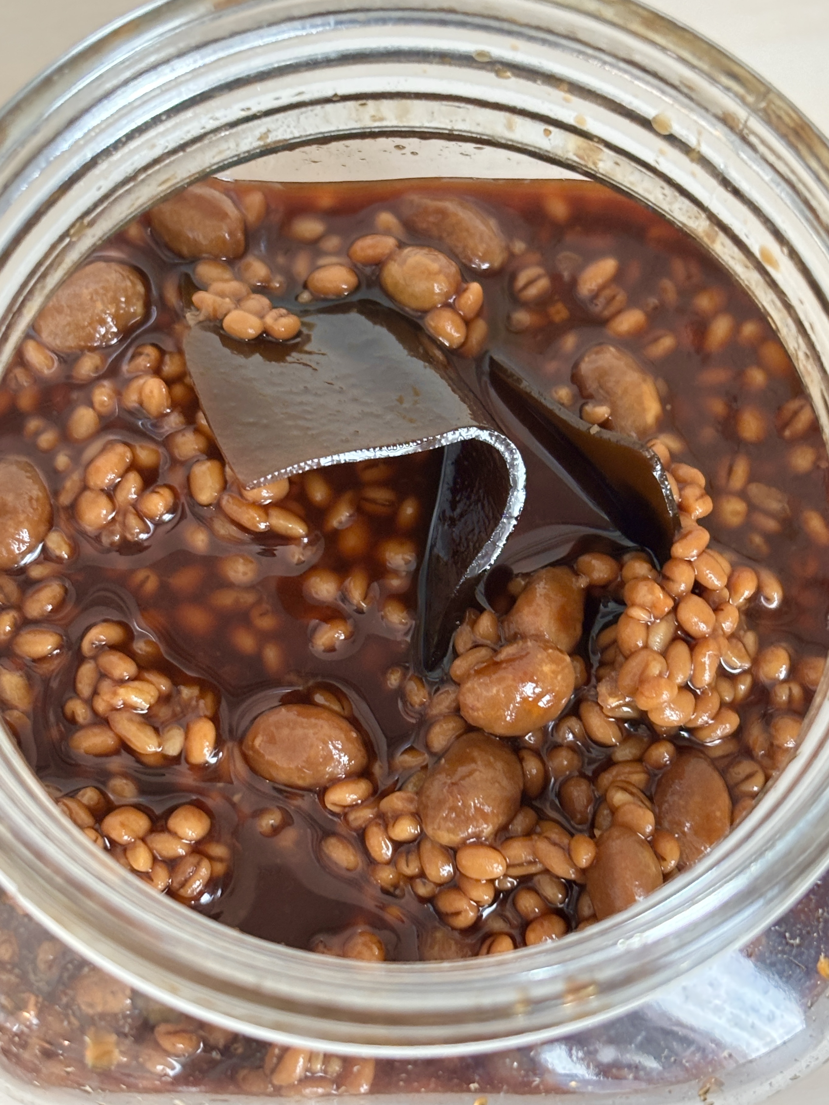 2日目あたりで、ひしお麹が水分を吸って表面が乾いてきたら、ひたひたになるまで醤油を足して下さい。
