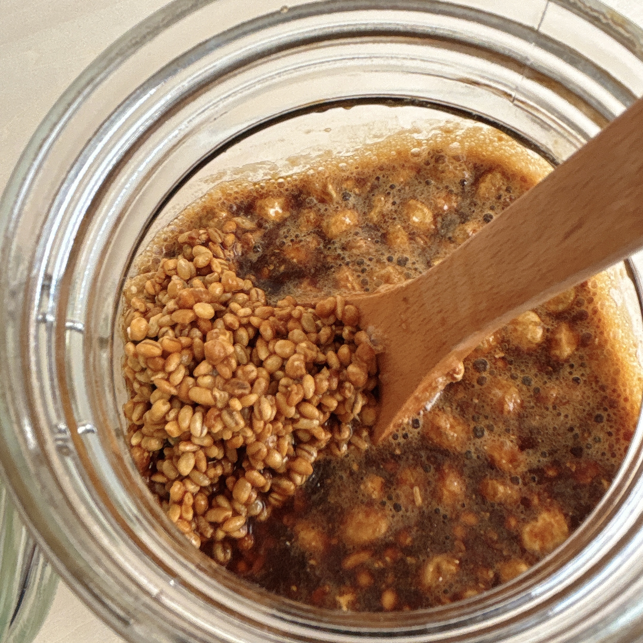 2. フタを軽く閉め、常温に置きます。1日1回、清潔なスプーンで全体に空気を送り込むように混ぜてください。