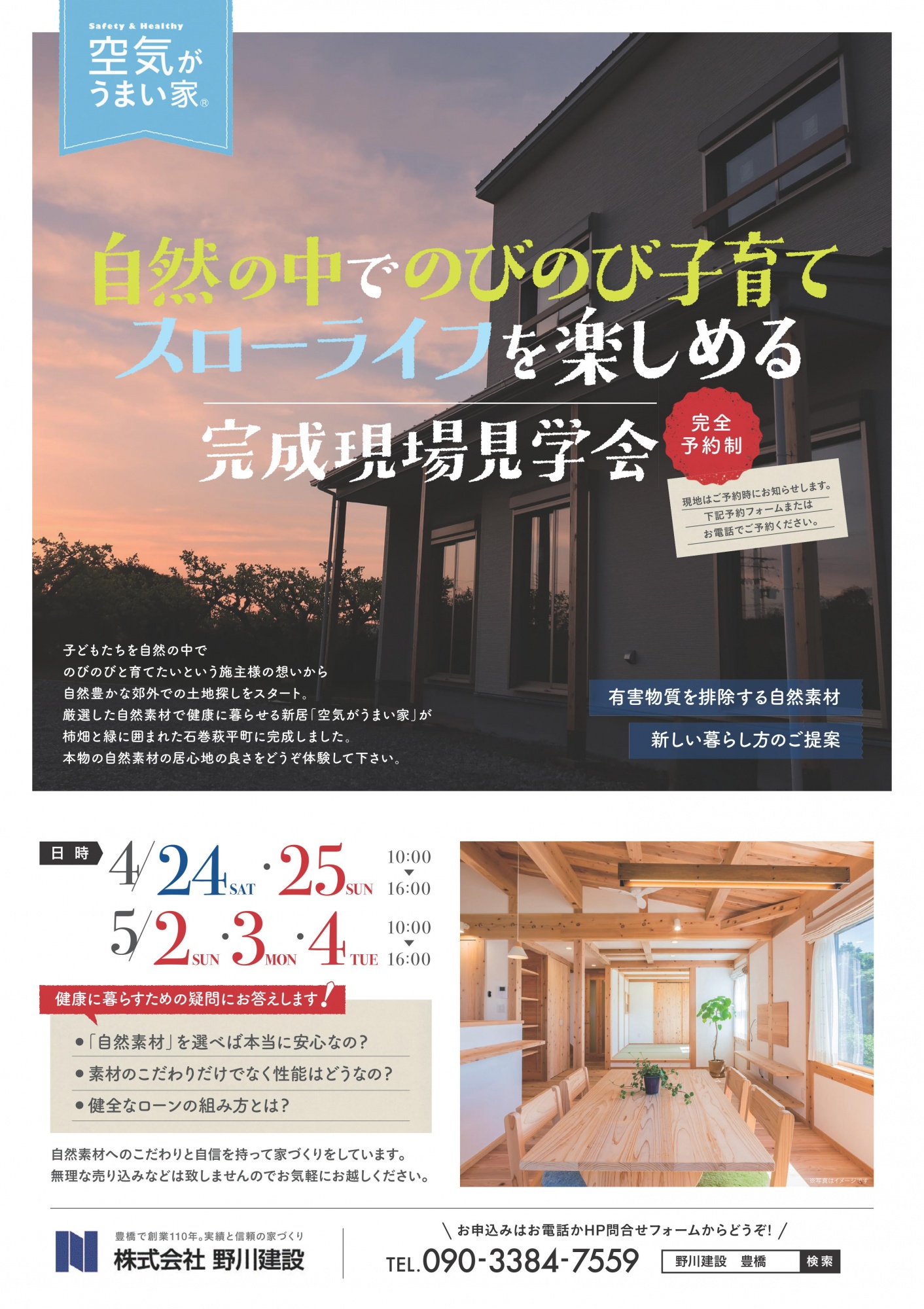 4/24(土)・25(日)、5/2(日)・3(月)・4(火) 豊橋市石巻萩平町にて完成見学会を開催致します。