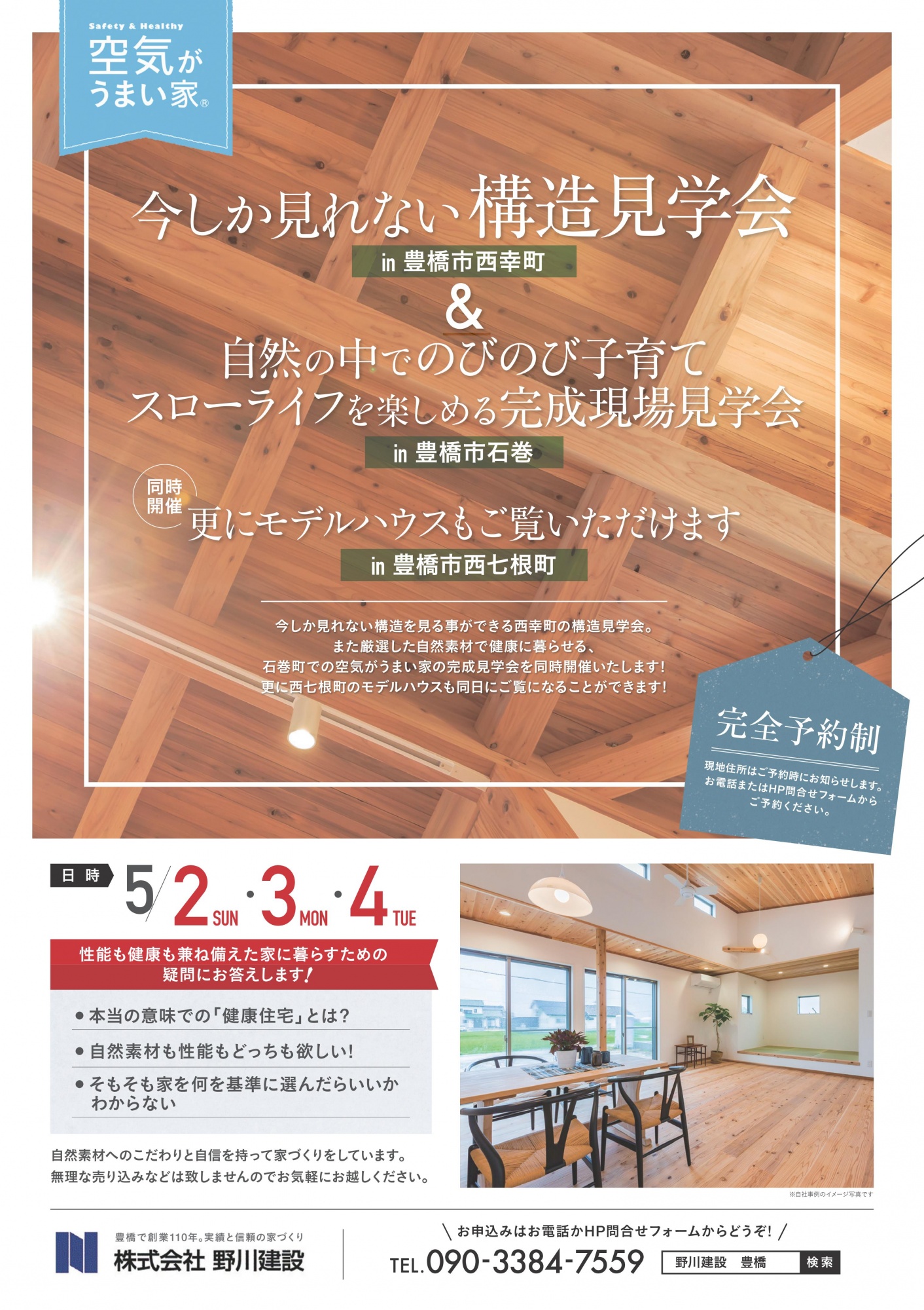 5/2(日)・3(月)・4(火) 豊橋市各所にて3棟同時見学会を開催致します。