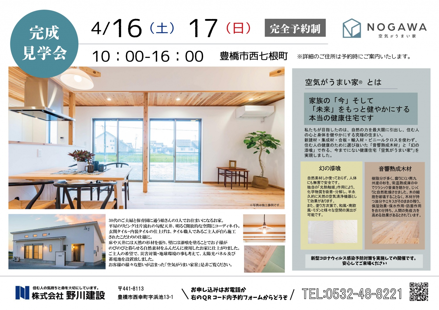4/15(土),16(日)豊橋市西七根町にて完成見学会を開催致します。