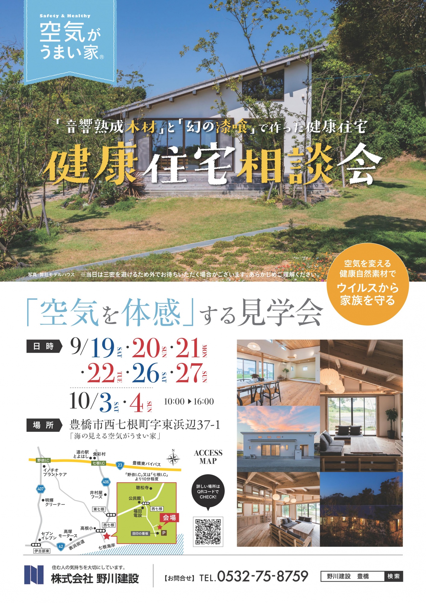 9/19~22、26、27、10/3、4 海の見える空気がうまい家にて健康住宅相談会を開催致します。
